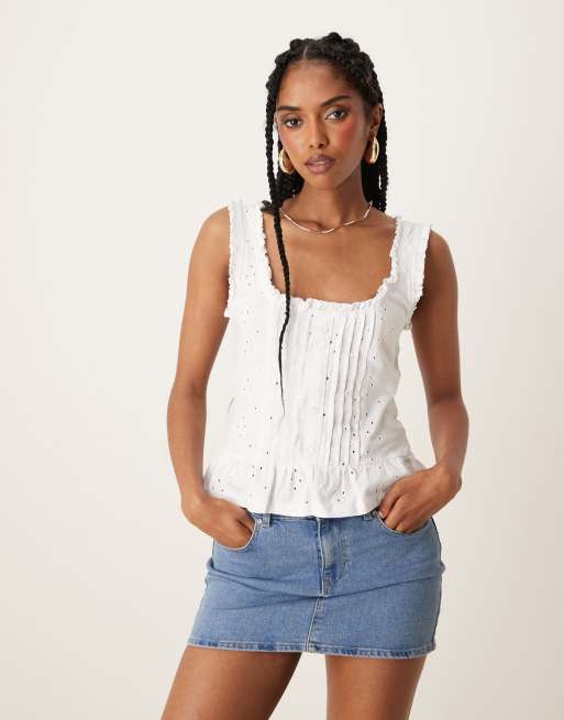 ASOS DESIGN - Hvid-broderet overdel med flæser og knapper