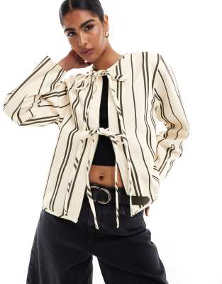 ASOS DESIGN - Hvid denimtop med bindebånd foran, lange ærmer og sorte striber
