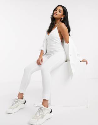 ASOS DESIGN — Hvid heldragt med dyb udskæring og smalle stropper