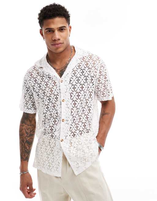 ASOS DESIGN - Hvid kortærmet skjorte med dyb reverskrave og blomsterblonder i afslappet pasform
