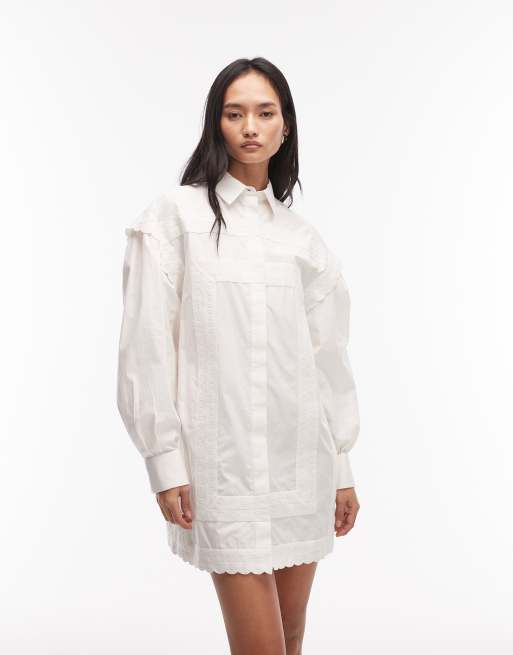 ASOS DESIGN - Hvid mini-skjortekjole i poplin med blondedetaljer