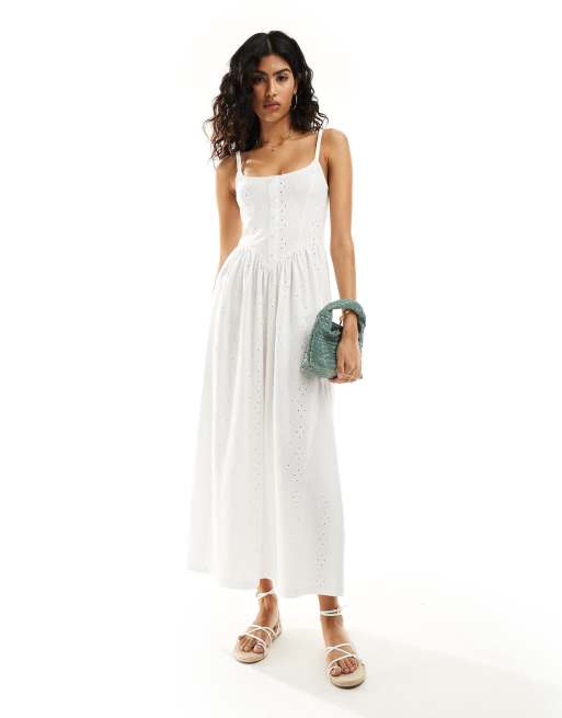 ASOS DESIGN - Hvid og broderet cami-midikjole med knapper fortil samt fyldig nederdel og prinsessesyninger
