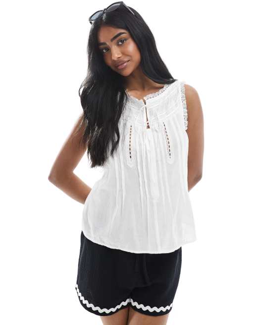 ASOS DESIGN - Hvid og ærmeløs top med blonde- og bånddetaljer