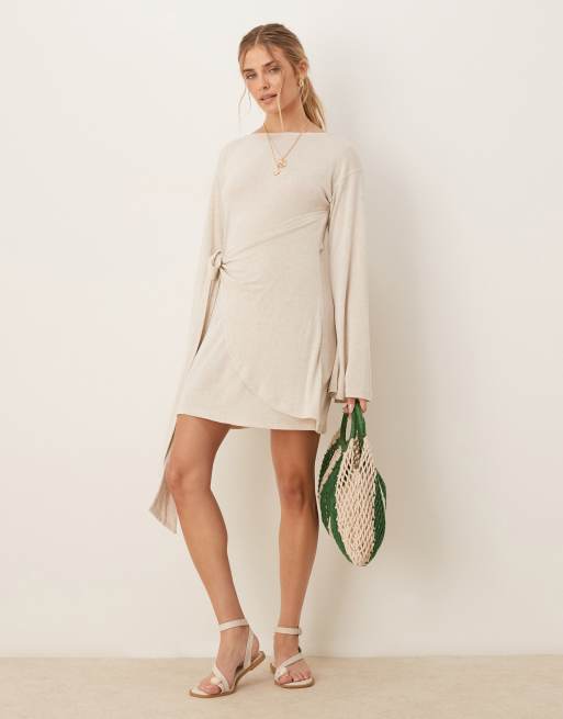 ASOS DESIGN - Hvid slå-om-minikjole med lange ærmer i hørlook