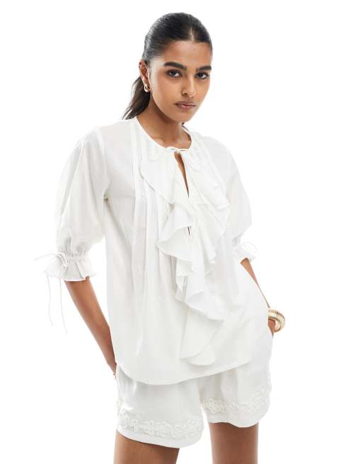 ASOS DESIGN - Hvid top med flæser og bindebånd foran og plisserede detaljer