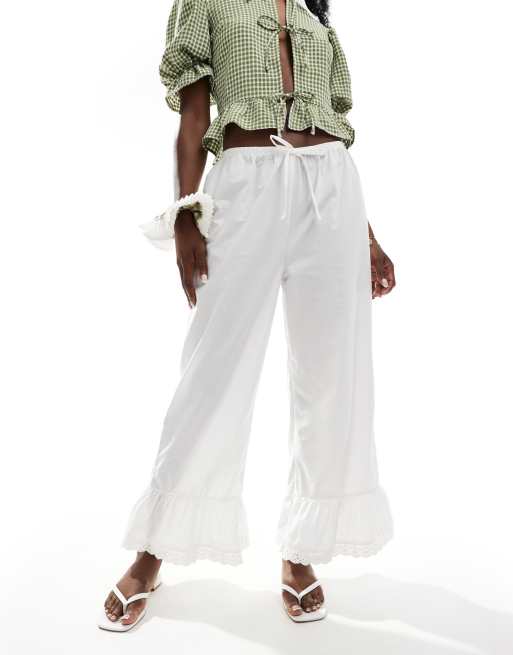 ASOS DESIGN - Hvide bukser med flæse- og blondekant i bomuld