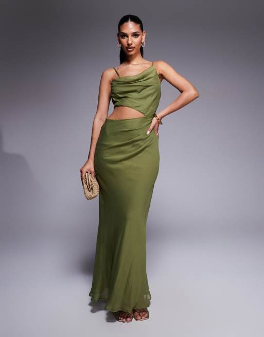 ASOS DESIGN - Kakigrøn asymmetrisk maxikjole med udskæring og drapering