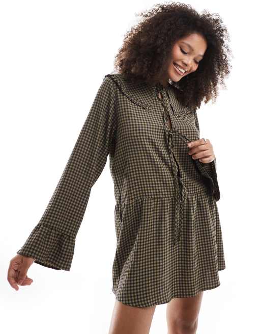 ASOS DESIGN - Kakigrøn minikjole med flæsekrave og bindebånd foran i gingham-tern