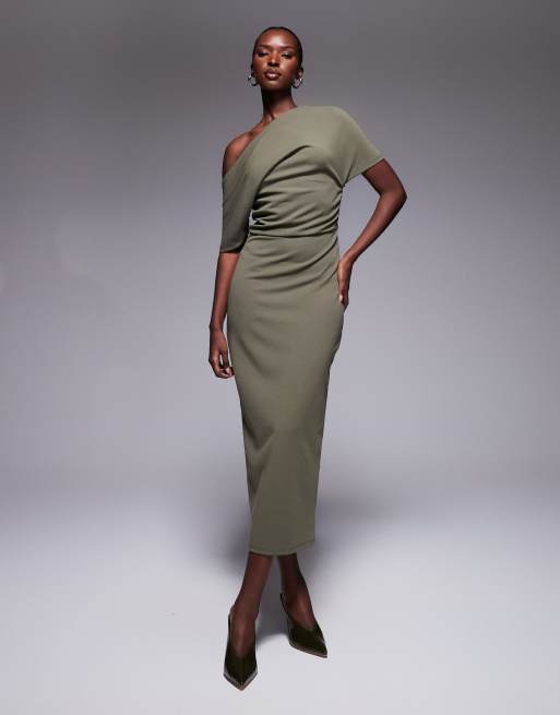 ASOS DESIGN - Kakigrøn pencil-midikjole med plisserede skuldre