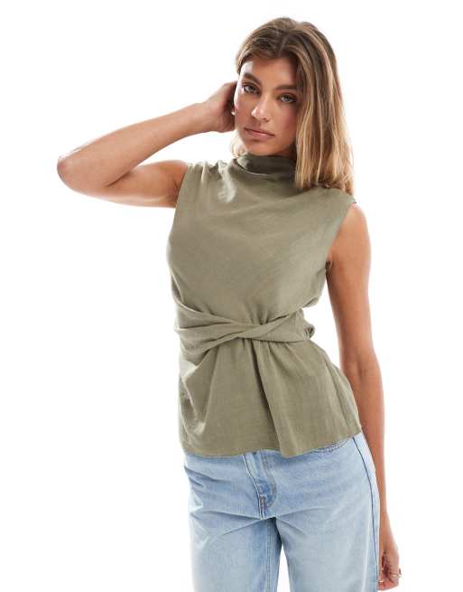ASOS DESIGN - Kakigrøn ærmeløs top med vandfaldsudskæring og snoet detalje i taljen i hørblanding