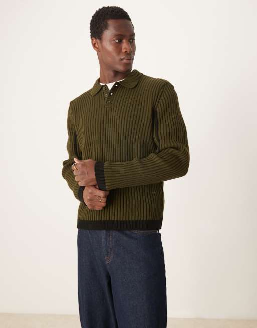 ASOS DESIGN - Kakigrøn strikket trøje med polokrave og kontrasterende striber i afslappet, firkantet pasform