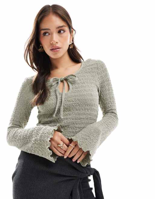 ASOS DESIGN - Kakigrøn top med asymmetrisk snit og tekstur samt engleærmer