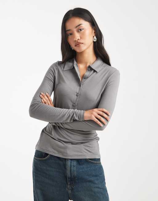 ASOS DESIGN - Koksgrå blød halvgennemsigtig poloskjorte med lange ærmer