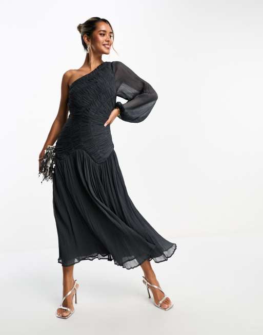 ASOS DESIGN - Koksgrå midikjole med oneshoulder og rynker
