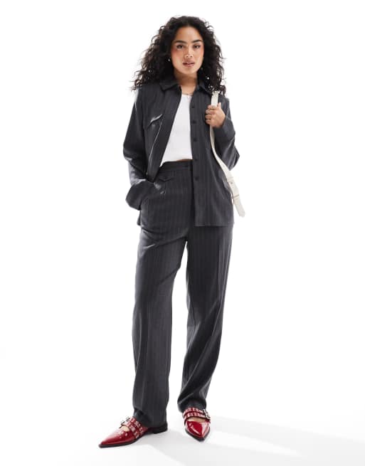ASOS DESIGN - Koksgrå og skræddersyede bukser med striber i børstet materiale med mærkedetalje og lige ben - Del af sæt