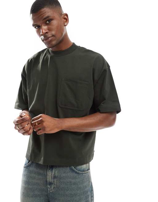 ASOS DESIGN - Koksgrå oversized T-shirt med tekstur, høj hals og brystlomme i firkantet pasform