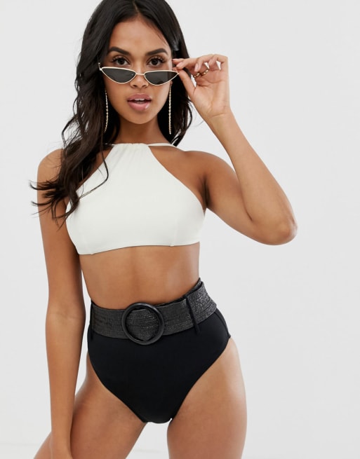 ASOS DESIGN Kontrast halterneck kort bikinitop i offwhite og sort