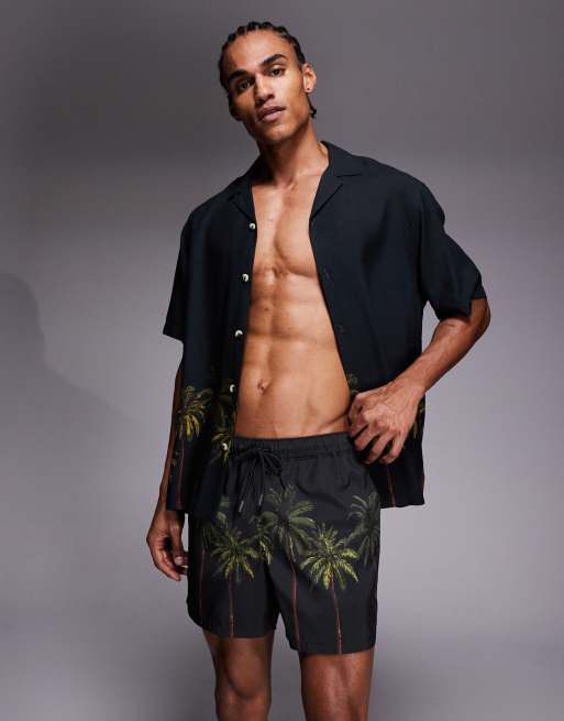 ASOS DESIGN - Korte sorte badeshorts med palmeprint - Del af sæt