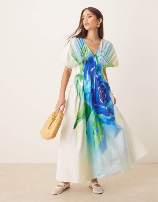 ASOS DESIGN - Kortærmet midikjole med V-hals, smalle pintucks og blåt roseprint