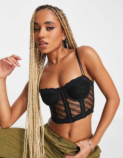 ASOS DESIGN - Kourtney - Sort korset med monogram-blonder og bøjle samt bindestropper