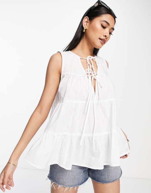 ASOS DESIGN - Lagdelt hvid smock-top med bindebånd foran