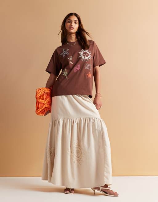 ASOS DESIGN - Lagdelt maxinederdel med blondeindsatser og broderier