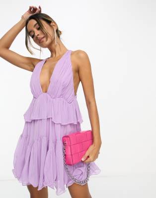 ASOS DESIGN - Lagdelt plisseret minikjole med dyb udskæring i lilla