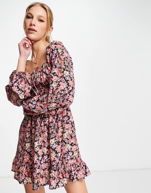 ASOS DESIGN - Langærmet mini-tea-kjole med bindebånd foran og lilla blomsterprint