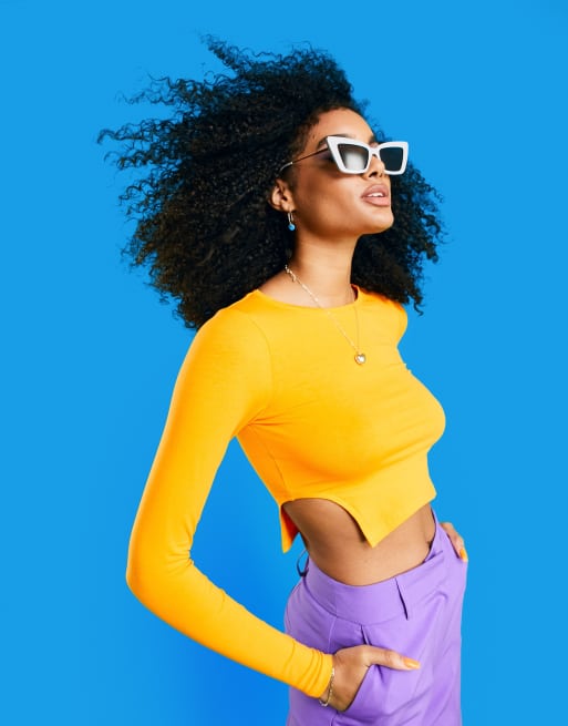 ASOS DESIGN - Langærmet orange croptop med formet kant i siden