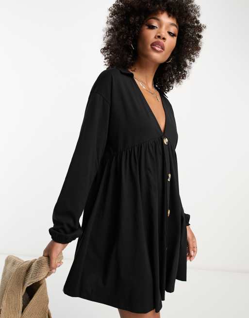 ASOS DESIGN - Langærmet smock-minikjole med knapper i sort