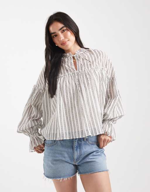ASOS DESIGN - Langærmet smock-top med flæsedetalje, bindebånd i halsen og striber i krølstof