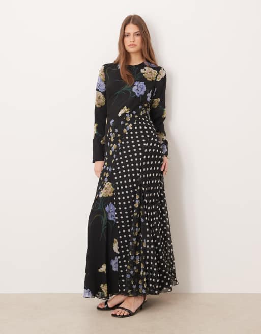 ASOS DESIGN - Langærmet sort maxikjole med racerhals og kilekant i prikket blomstermønster