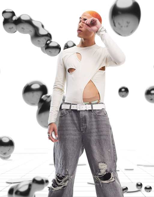 ASOS DESIGN - Langærmet T-shirt med flere udskæringer i creme