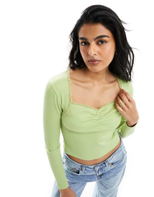 ASOS DESIGN - Langærmet top med hjerteformet hals og picot-detaljer i salviegrøn