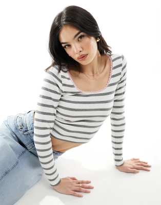 ASOS DESIGN - Langærmet top med striber og lyserød picot-kant i hvid