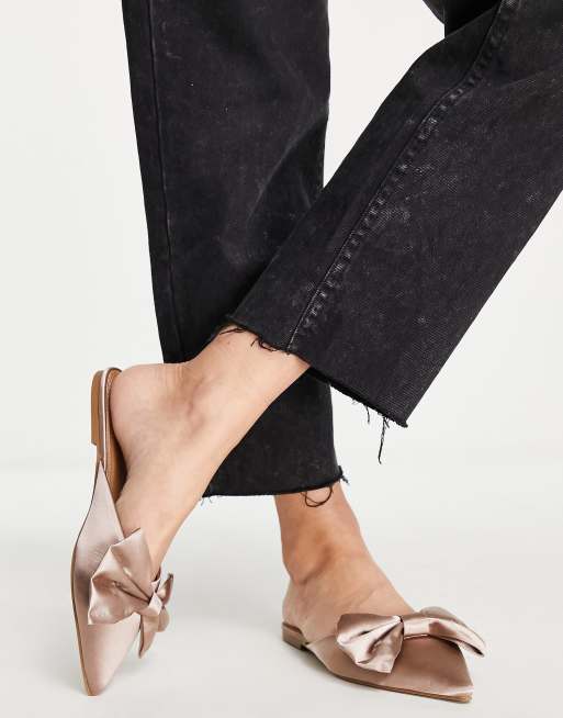 ASOS DESIGN - Lass - Gråbrune spidse flade mules i satin med overdimensioneret sløjfe