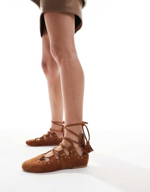 ASOS DESIGN - Lasso Boho Ghillie - Gyldenbrune ballerinaer i ruskind med bindebånd