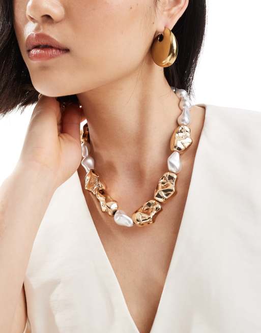 ASOS DESIGN - Limited Edition - Guldfarvet halskæde med hamrede perler og imiterede ferskvandsperler