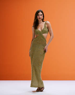 ASOS DESIGN - Lys kakifarvet midikjole i fløjl med udsmykninger og kunstneriske brystdetaljer