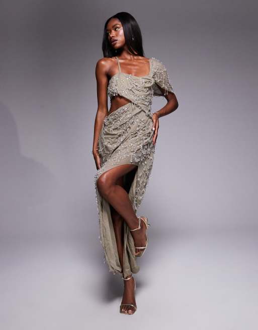 ASOS DESIGN - Lysegrå offshoulder-maxikjole med bandeau-snit, drapering og perleudsmykninger