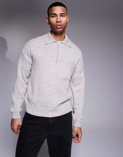 ASOS DESIGN - Lysegrå og strikket polo med lynlås i halsen og brystlomme i afslappet og firkantet pasform