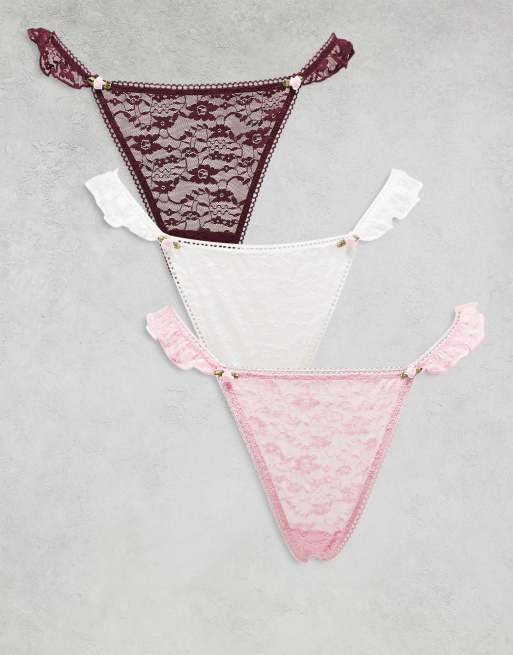 ASOS DESIGN - Lyserød/hvid/chokoladebrun tanga-G-streng i blondemateriale med blondeflæser i siden og roser i kanten i pakke med 3 par
