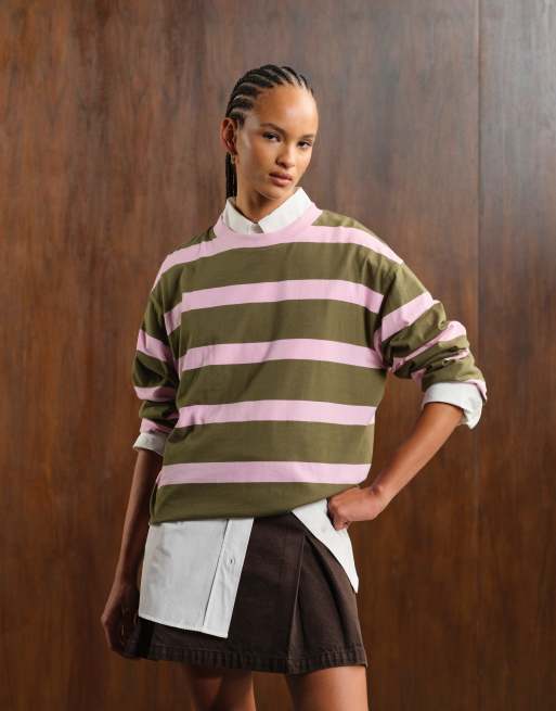 ASOS DESIGN - Lyserød og kakigrøn oversized T-shirt med lange ærmer og striber