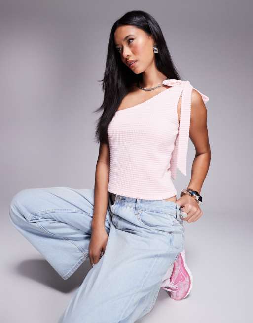 ASOS DESIGN - Lyserød oneshoulder-top med tekstur og sløjfestropper
