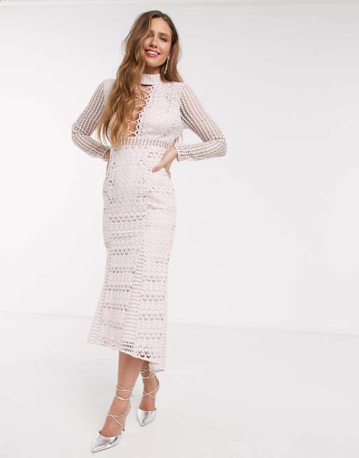 ASOS DESIGN - Lyserød peplum-midikjole med blonder og lange ærmer samt snøredetalje