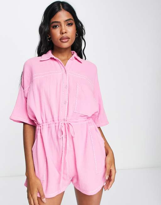 ASOS DESIGN - Lyserødt skjorte-playsuit i lyserødt dobbeltstof med kontrastdetalje
