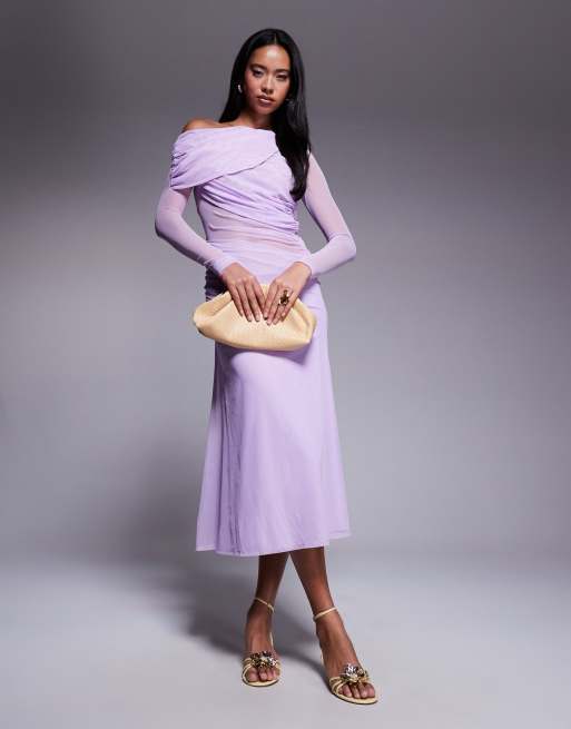 ASOS DESIGN - Lyslilla og langærmet Bardot-maxikjole med løstsiddende pasform i meshblanding