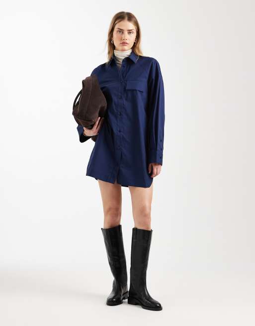 ASOS DESIGN - Marineblå langærmet skjortekjole i minilængde med forlommer