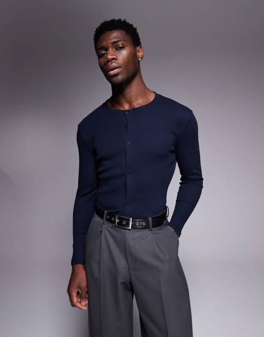 ASOS DESIGN - Marineblå ribstrikket tætsiddende T-shirt med knapper og lange ærmer i firkantet pasform