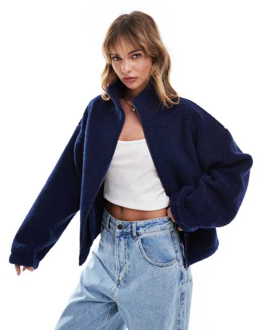 ASOS DESIGN - Marineblå trøje med høj hals og lynlås i imiteret lammeskind - Del af sæt
